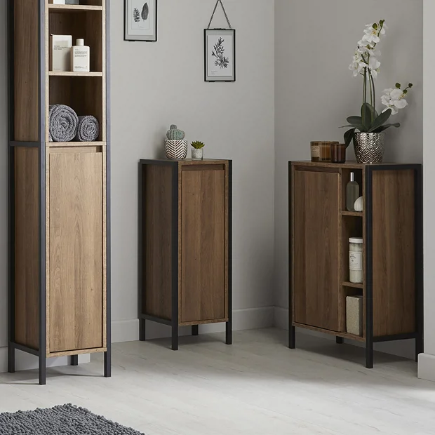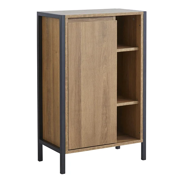 Milan Industrial Matt Black Framed Console Bathroom Storage Unit with Open Shelves – Wood Effect