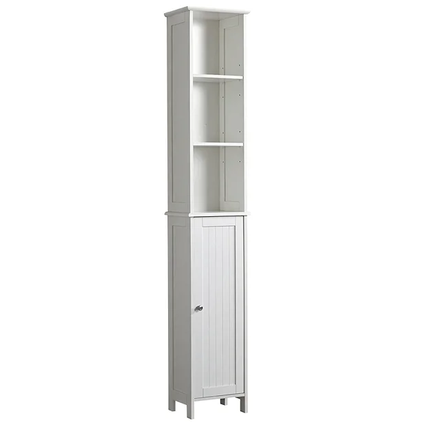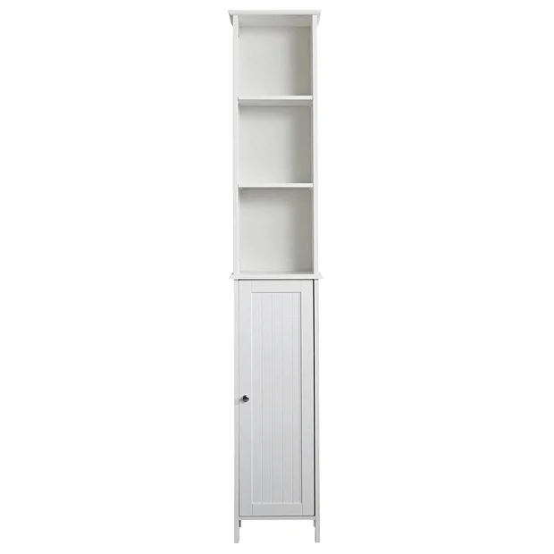 Add traditional design to your bathroom with the matt white tall storage unit, features classic styling with a tongue-and-groove design. The tallboy bathroom storage unit is great for maximising space and for keeping things neat and tidy! Provides generous storage space for your toiletries, helping to keep your bathroom clutter free, cabinet has internal shelving to store your bathroom essentials, as well as an open shelves for additional easy access storage.ย