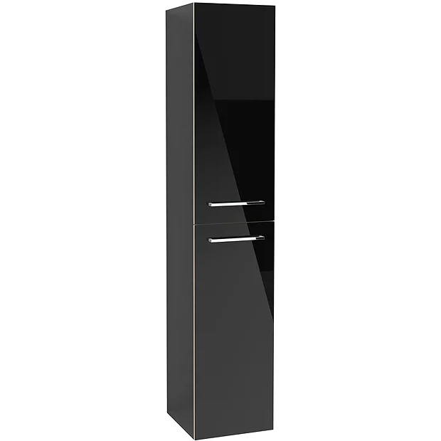 Villeroy & Boch Avento furniture is practical, beautiful and a real highlight in the bathroom. This Crystal Black Wall Hung Tall Cabinet has plenty of storage space for everything keeping the bathroom tidy whilst adding a stylish touch. Visual highlights with champagne-coloured decorative edges and classy chrome handles give a light and modern look.